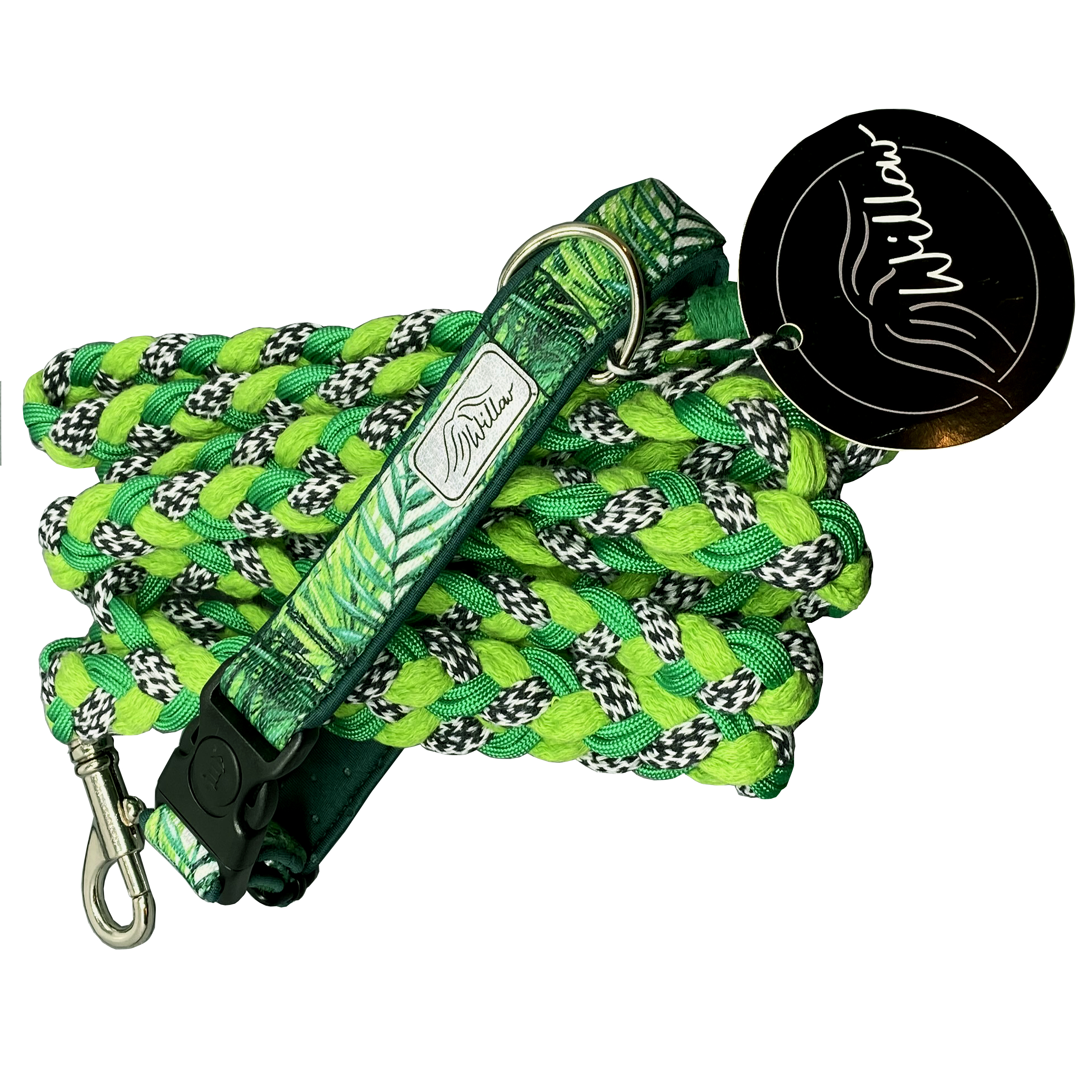 2 metrowa smycz pleciona z 4 bawełnianych sznurów wzmocnionych poliestrowym rdzeniem oraz 2 linek Paracord wytrzymującej obciążenie do 250 kg każda. Miękka w dotyku, ale wytrzymała i lekko amortyzująca.