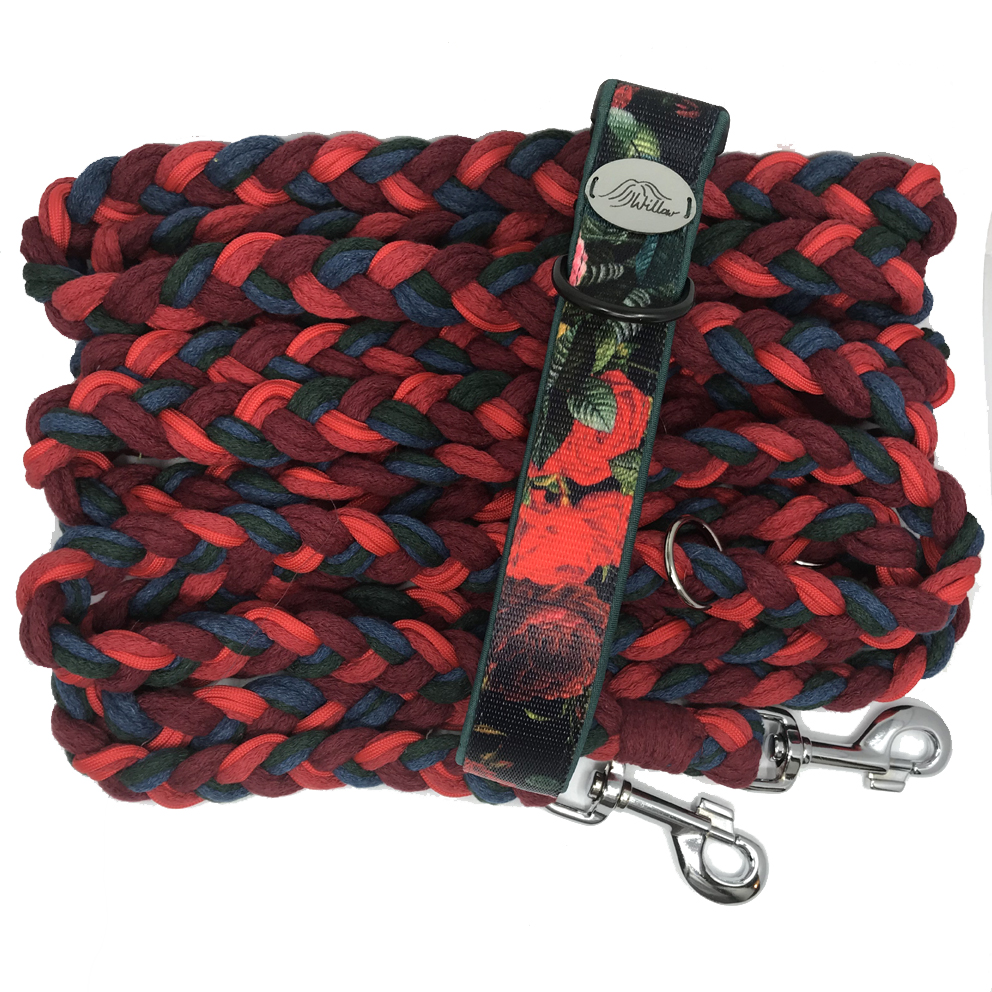 Smycz przepinana, pleciona z 10 bawełnianych sznurów wzmocnionych poliestrowym rdzeniem oraz 2 linek spadochronowych Paracord o wytrzymałości 250 kg. Dwa bardzo mocne karabińczyki oraz 2 spawane kółka do przepinania. Smycz jest miękka w dotyku, ale wytrzymała i lekko amortyzująca. Długość 2,5 metra.