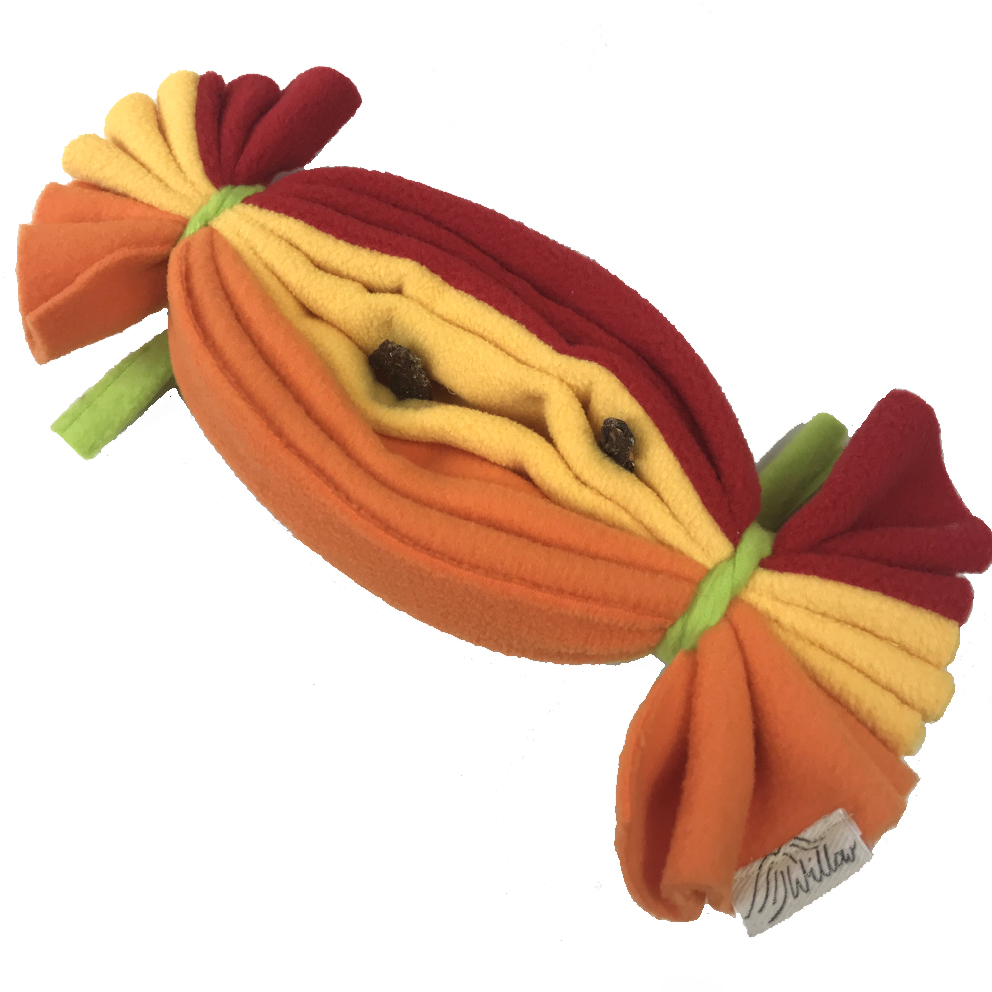 Cukierek to świetna zabawka węchowa dla Twojego psa. Zabawki węchowe są polecane przez psich behawiorystów na całym świecie, gdyż pomagają psom zaspokoić ich naturalną potrzebę poszukiwania jedzenia. Cukierek wykonany z polaru i ścisło złożony w harmonijkę znakomicie służy do ukrywania przysmaków. Świetnie chowa się w nim kawałki suszonego mięsa. Można regulować stopień trudności zabawy wpychając głębiej smakołyk pomiędzy  przylegające powierzchnie lub pozwalając im trochę wystawać dla łatwiejszego wydobycia.