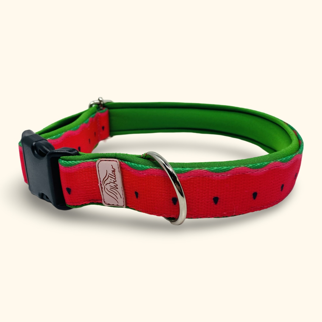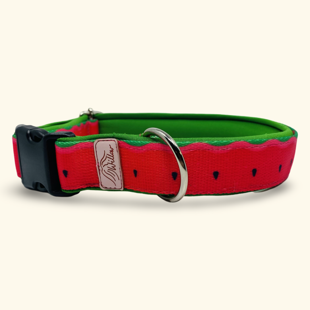 Obroża wykonana z bardzo wytrzymałej taśmy nośnej, podszytej mięciutką pianką neoprenową.