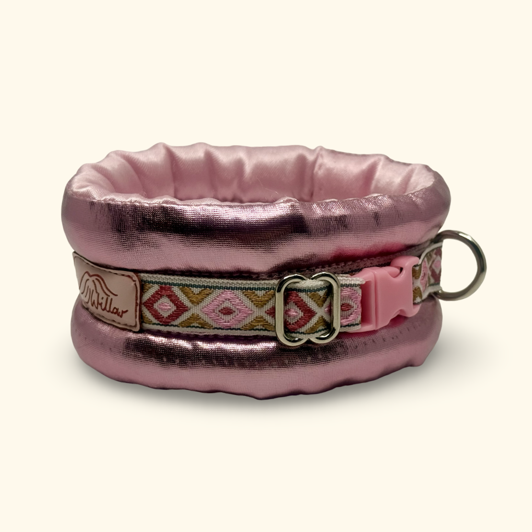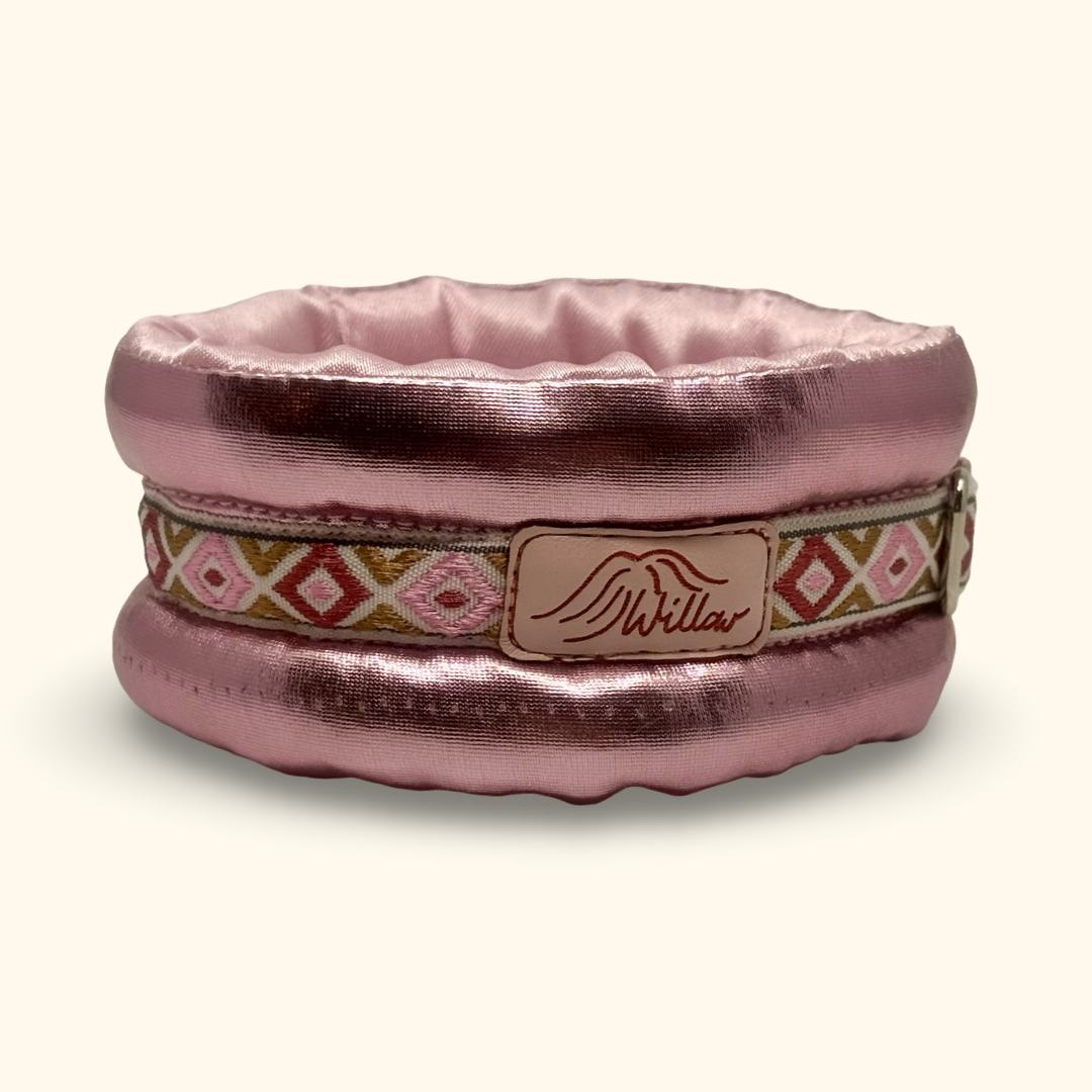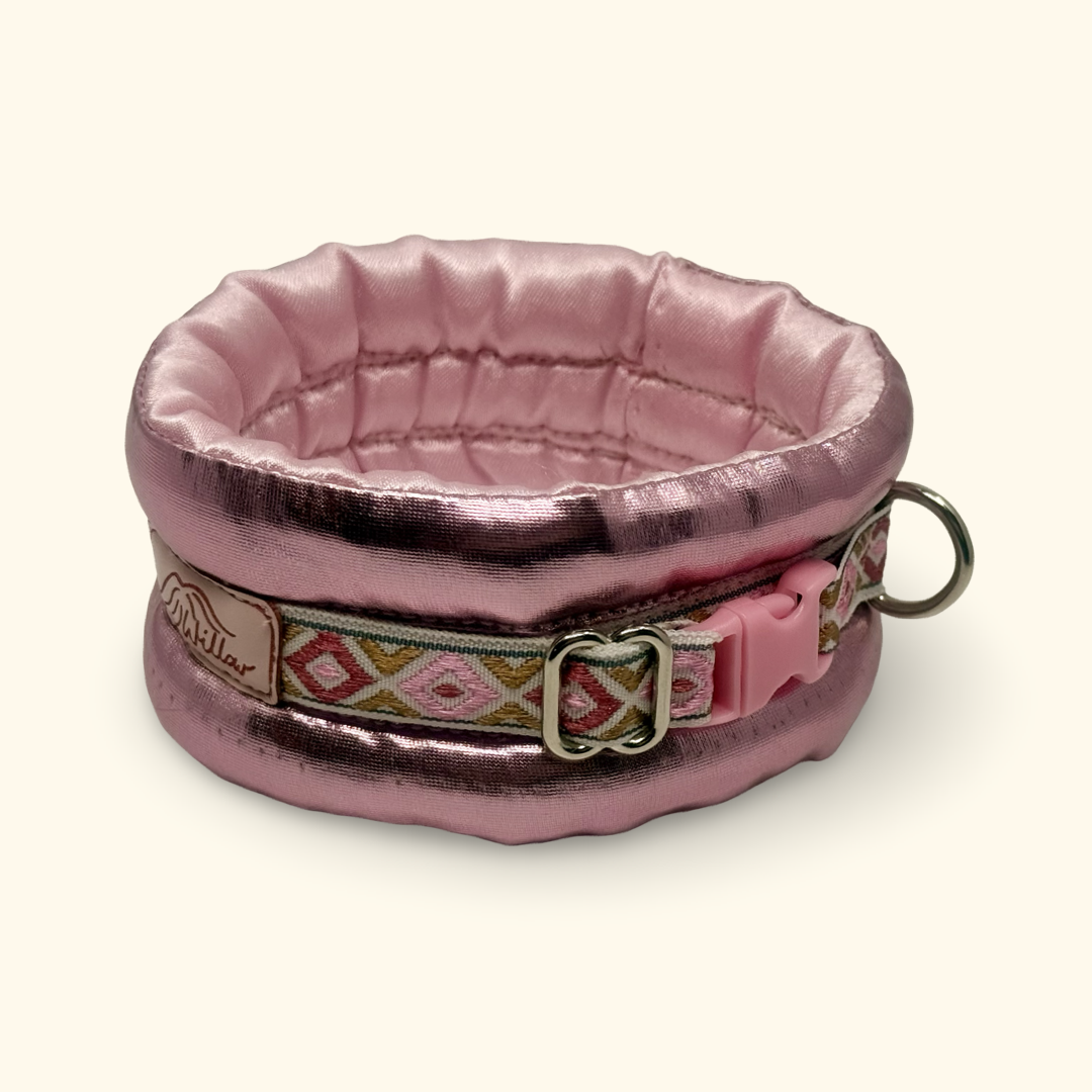 Delikatna i komfortowa obroża dla pudla „Excellent” w klasycznym różu została stworzona z myślą o psach o długich szyjach. Jej miękka konstrukcja i szeroka forma nie tylko podkreślają elegancję pupila, ale też chronią jego kręgosłup szyjny na co dzień.