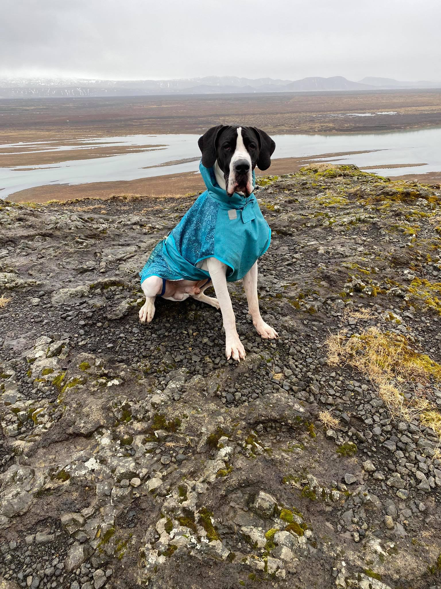 Płaszcz dla psa przeciwdeszczowy. Model stworzony dla psów ras dużch i olbrzymich. Nie krępuje ruchów psa, zakrywa brzuch psa, jest zapinany na rzepy oraz dodatkowo klamrę zatrzaskową. Można w nim swobodnie biegać. Kaptur zabezpiecza również głowę psa przed zmoknięciem.