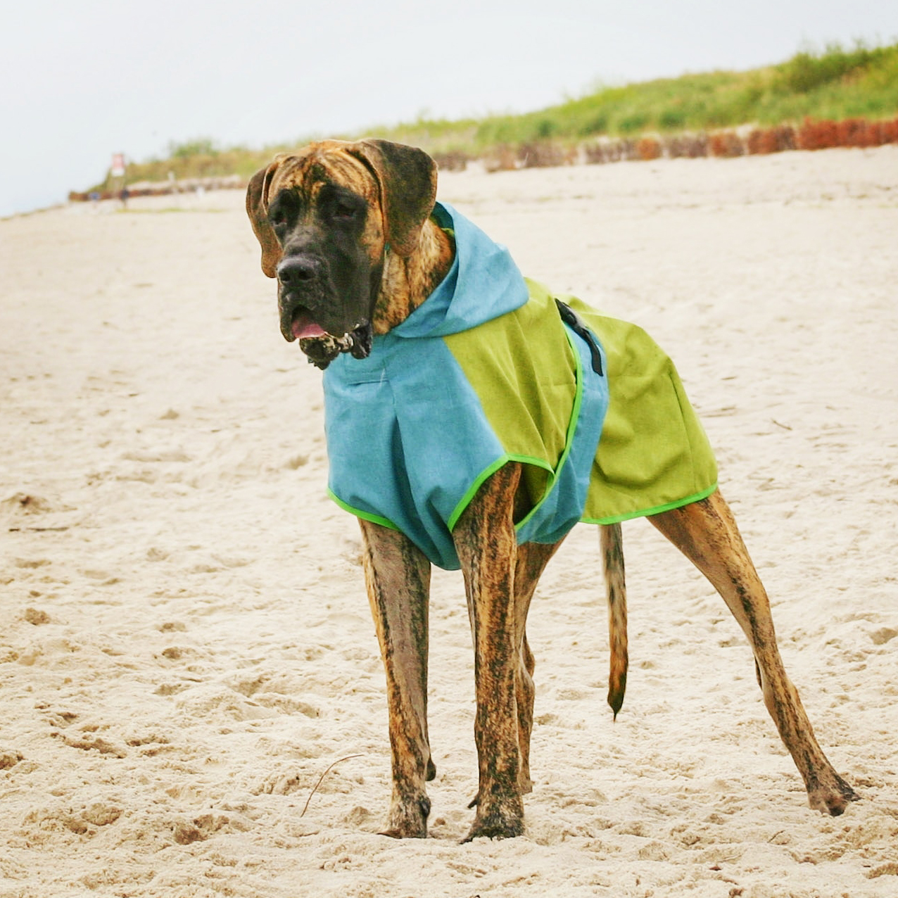 Płaszcz przeciwdeszczowy dla dużego psa. Model stworzony dla psów ras dużch i olbrzymich. Nie krępuje ruchów psa, zakrywa brzuch psa,jest zapinany na rzepy oraz dodatkowo klamrę zatrzaskową. Można w nim swobodnie biegać.Kaptur zabezpiecza również głowę psa przed zmoknięciem.
