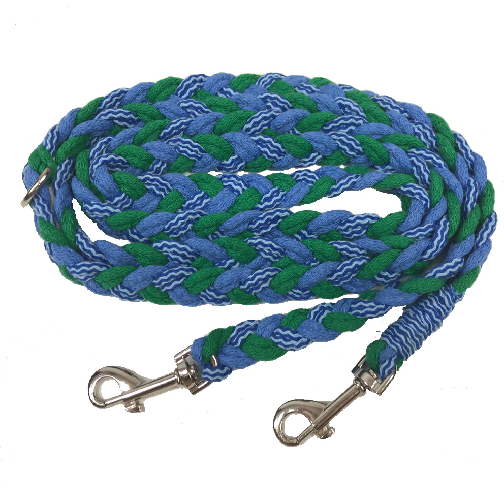 Ręcznie pleciona smycz dla psa. Wykonana z bawełnianego sznurka o średnicy 5 mm z poliestrowym rdzeniem. Jest wytrzymała, ale miękka i przyjemna w dotyku. Miło trzyma się ją w dłoni, w przeciwieństwie do linek ze sztucznego tworzywa. Zapleciona warkoczem z sześciu sznurków. Nadaje się dla małych i średnich piesków. Dla dużych możliwość zastosowania większego karabińczyka oraz podwójnej ilości linek.