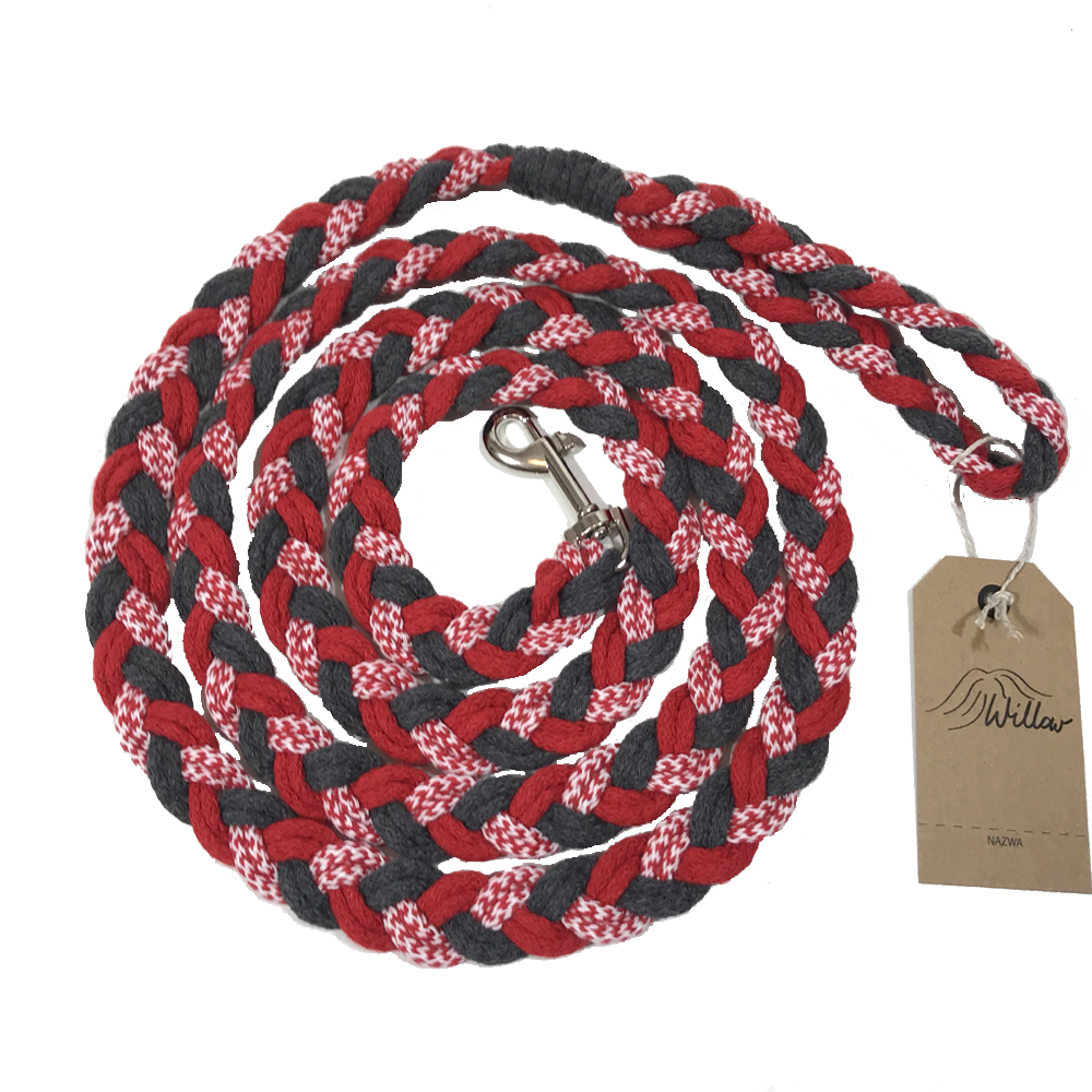 Ręcznie pleciona smycz dla psa. Wykonana z bawełnianego sznurka o średnicy 5 mm z poliestrowym rdzeniem. Jest wytrzymała, ale miękka i przyjemna w dotyku. Miło trzyma się ją w dłoni, w przeciwieństwie do linek ze sztucznego tworzywa. Zapleciona warkoczem z dwunastu sznurków. W tym dwie linki to survivalowy amerykański Paracord. Smycz nadaje się nawet dla bardzo silnych i dużych piesków. Dla mniejszych możliwość zastosowania mniejszego karabińczyka oraz 6-ciu linii sznura.