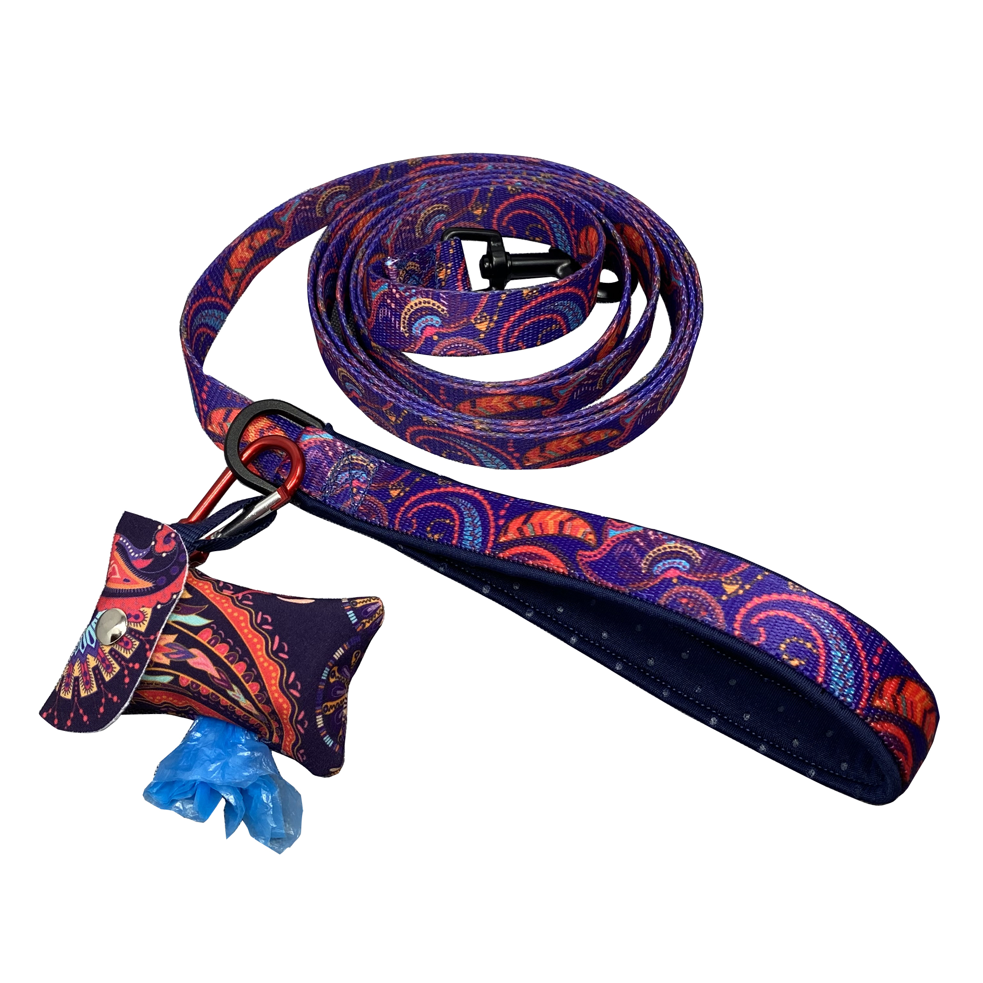 Wytrzymała smycz uszyta z taśmy o wzorze „Paisley”, szerokości 20 mm. Smycz ma w uchwycie podszycie z pianki neoprenowej, aby wygodniej trzymać ją w dłoni. Pod rączką wszyliśmy półkółko do zawieszenia etui na woreczki. Etui w zestawie.  Wzór taśmy pasuje do innych naszych produktów, szelek, obroży i pasów do auta.