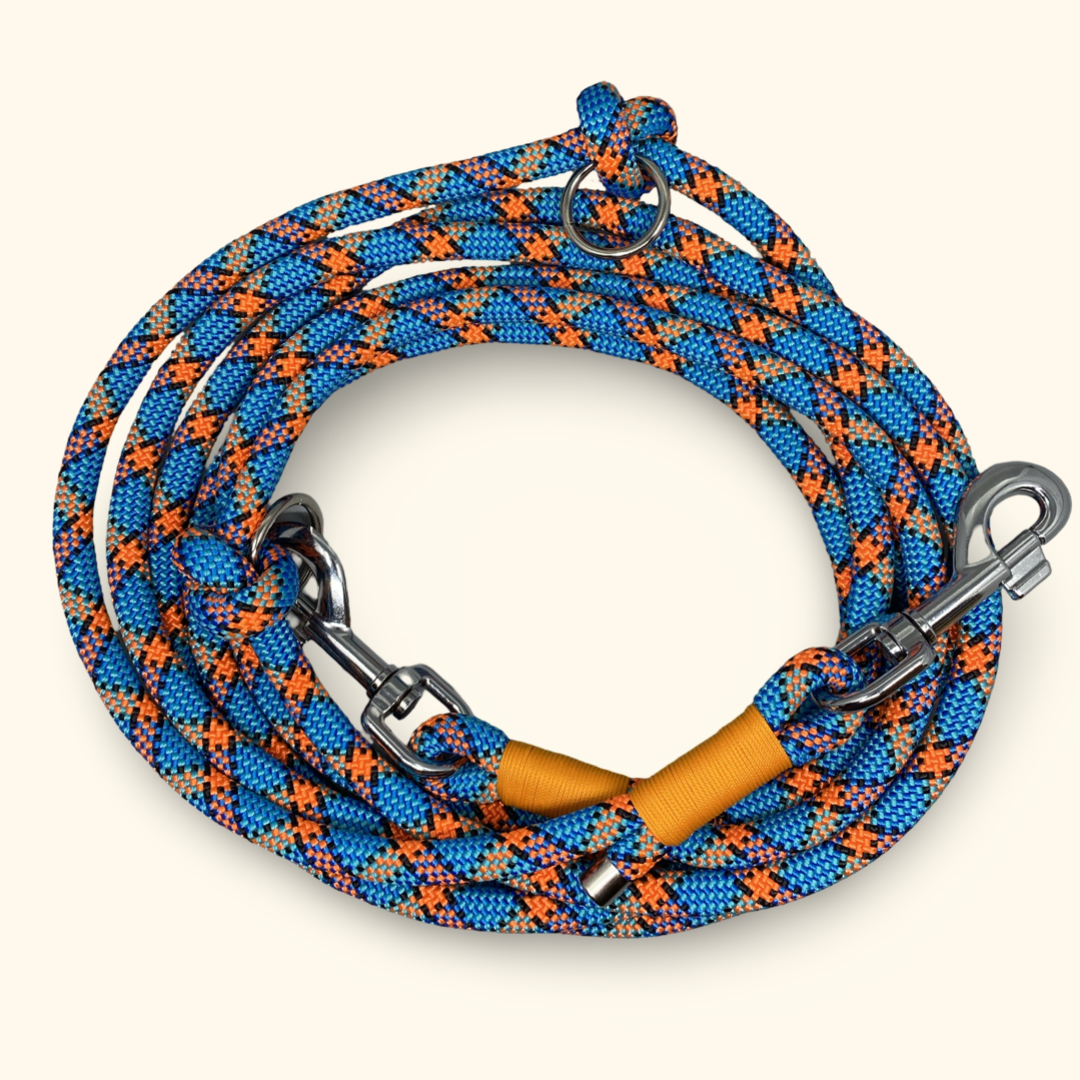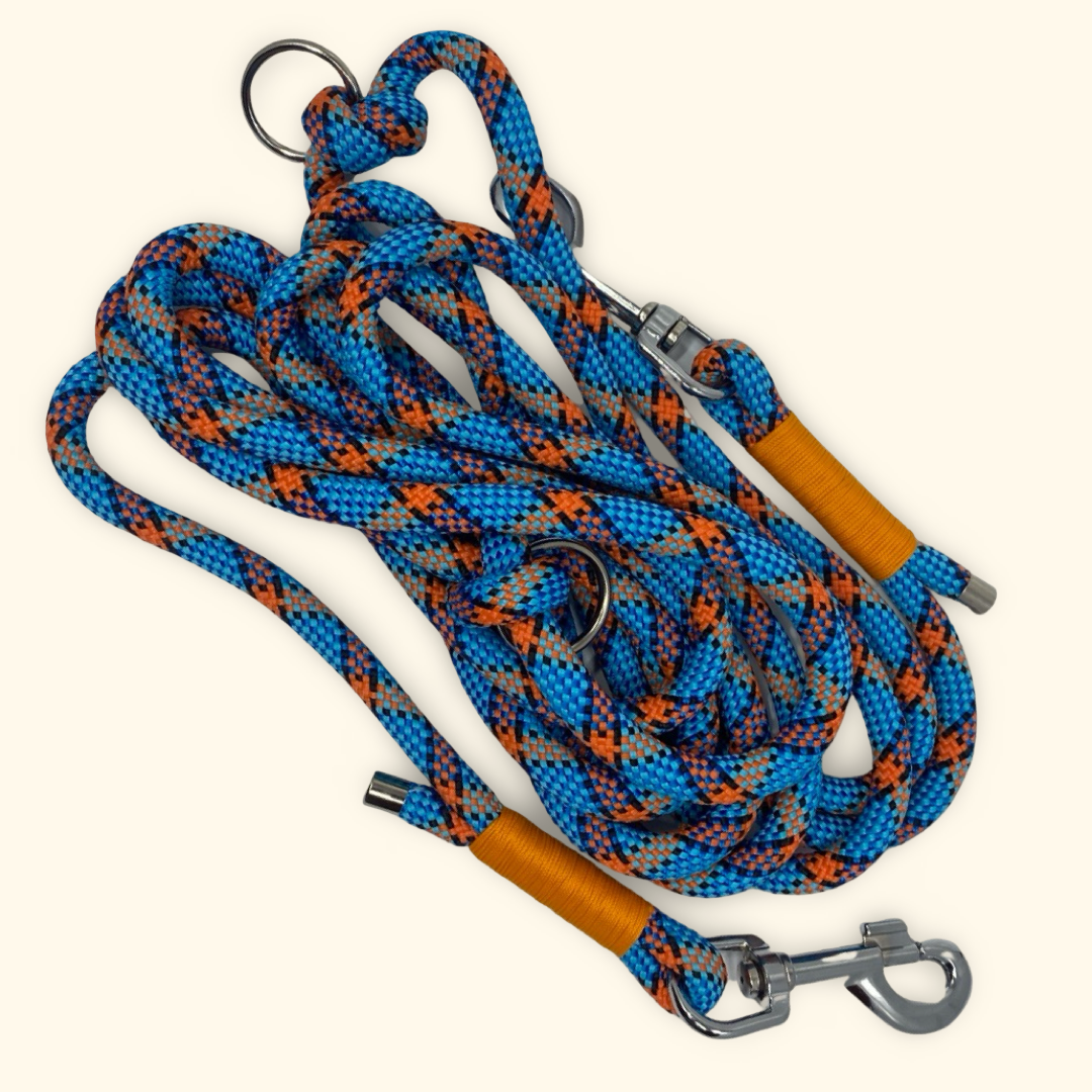 Ręcznie robiona smycz linowa wykonana z paracordu oraz liny polipropylenowej o średnicy 10mm , która charakteryzuje się bardzo duża wytrzymałością (siła zrywająca to aż 1000kg), trwałością oraz odpornością na działanie wody.