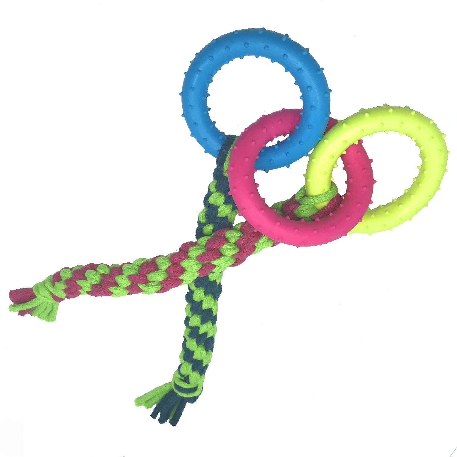 Szarpak bawełniany z kółkiem to fantastyczna zabawka, ale nie tylko! Włókna bawełny świetnie ścierają kamień nazębny, a zabawa w szarpanie pozwala pozbyć się resztek jedzenia. Doskonały do zabawy we dwójkę. Jest bezpieczny dla szczeniaczków. Kółko o zapachu mięty, nadaje się do higieny jamy ustnej. Wykonane z trwałej i wytrzymałej gumy termoplastycznej. Jest to wyjątkowo elastyczne i miękkie, materiał bardzo przyjazny dla zebów oraz dziąseł psa. Kolejną istotną cechą bardzo absorbującą uwagę psa do zabawy jest jej zapach.