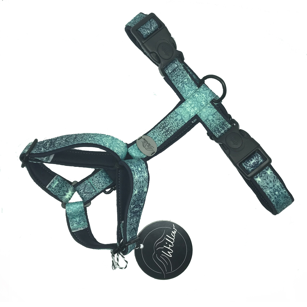 Szelki paskowe typu Guard, podszyte mięciutką pianką neoprenową, zapobiegającą obtarciom. Konstrukcja szelek rozkłada naprężenia tak, aby nie obciążać kręgosłupa psa oraz nie wykrzywiać stawów ani przednich łap.