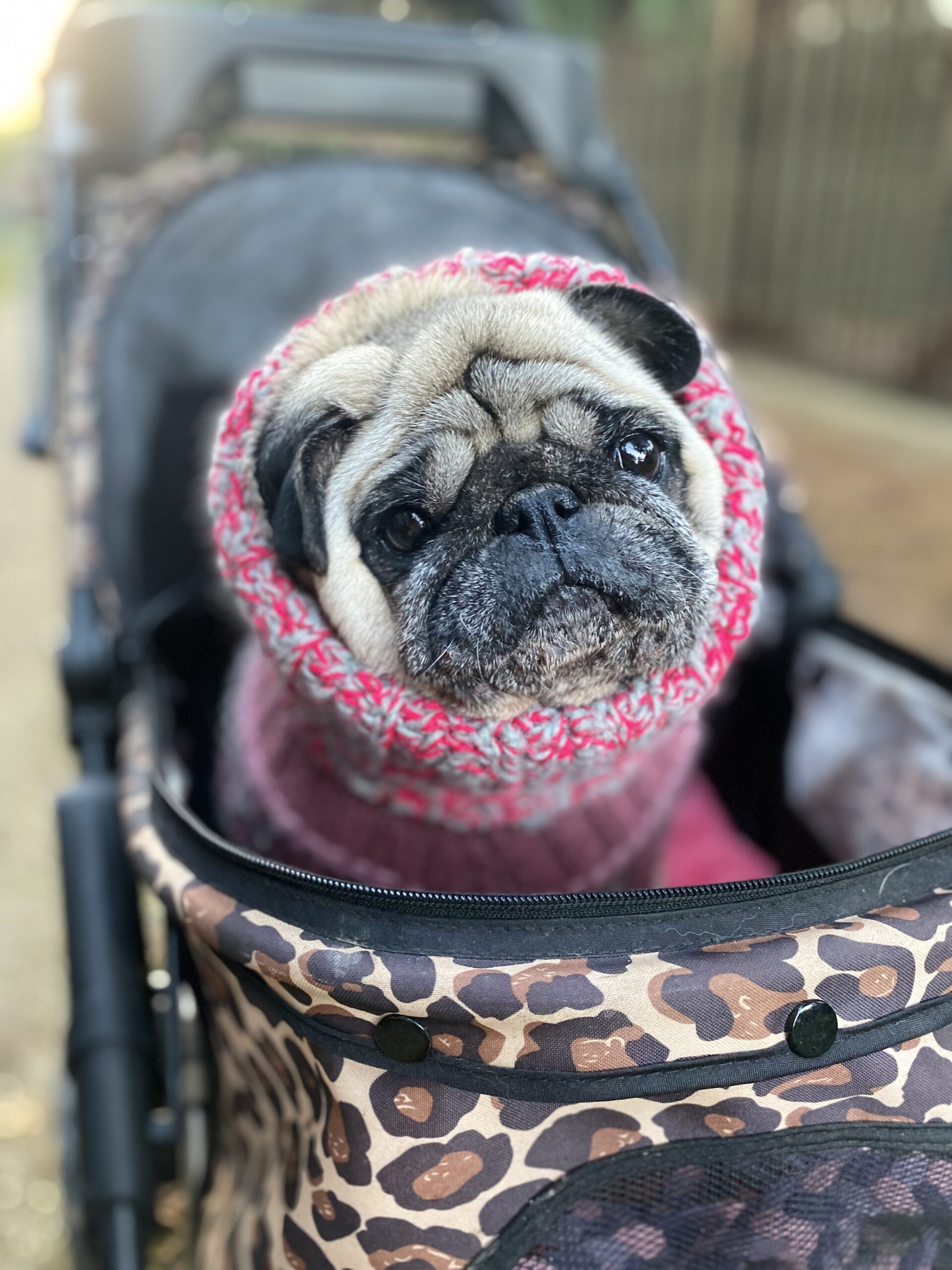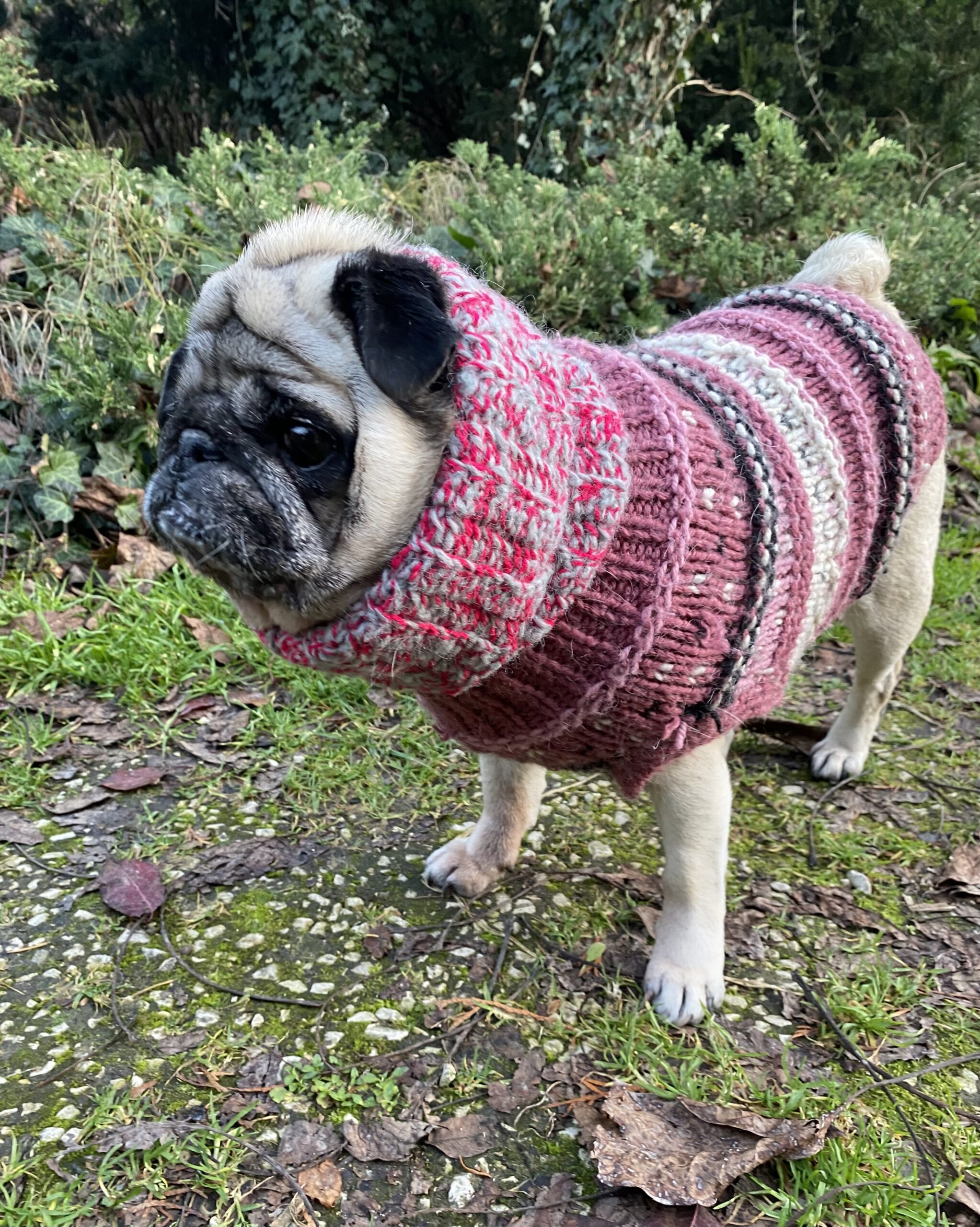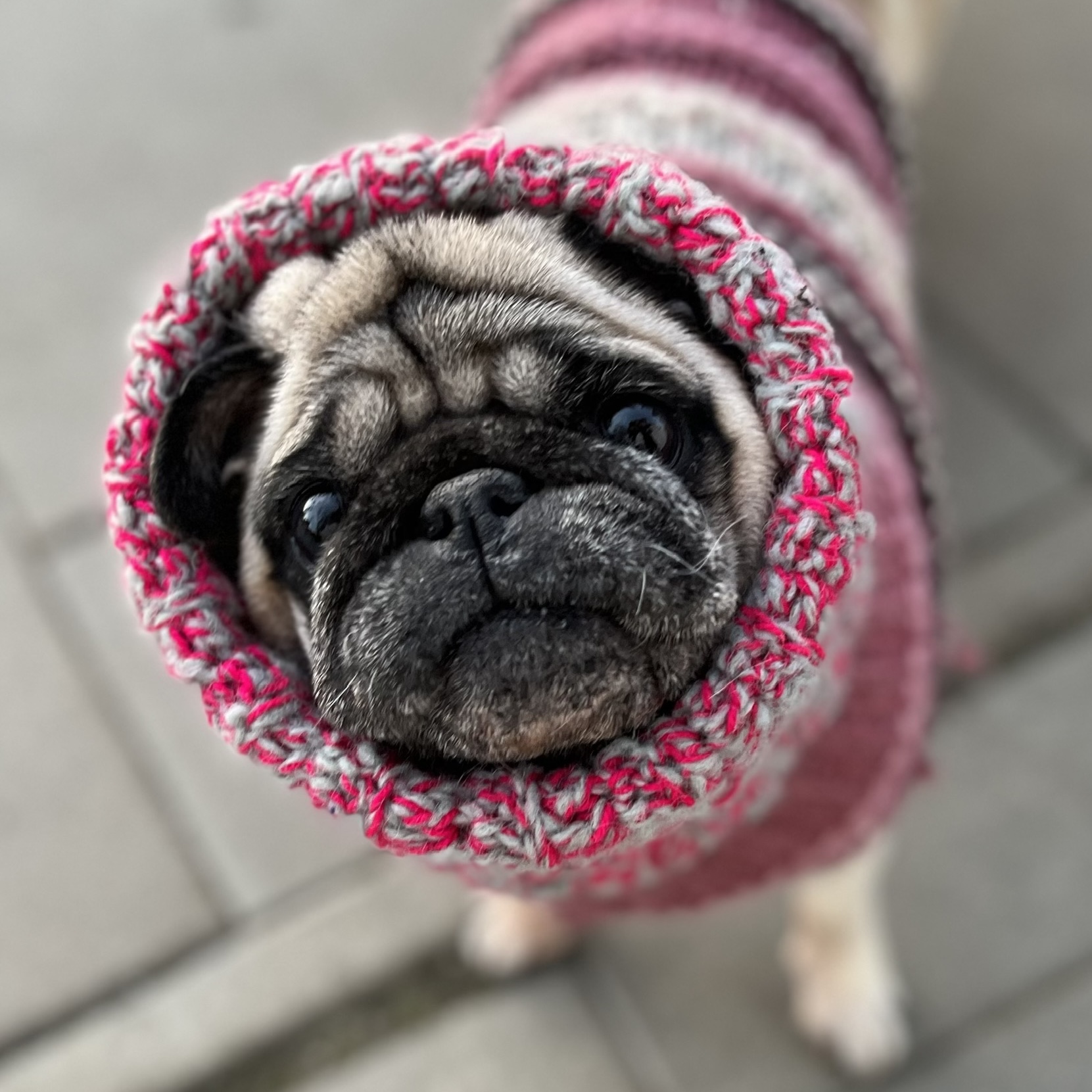 Wełniany, ręcznie robiony komin chroni uszy i szyję psa przed wiatrem i chłodem. Snood wykonany jest na szydełku z miękkiej i ciepłej mieszanki wełny z akrylem, nie podrażnia delikatnej skóry psa. Piesek się nie przegrzewa, a jest chroniony przed zimnem , a także śniegiem, gdyż w wełnę nie wsiąka zbyt szybko wilgoć.  Komin jest na górze ściągany gumeczką z regulatorem, co pozwala dopasować komin do obwodu głowy psa. Ponadto komin nie zsuwa się.